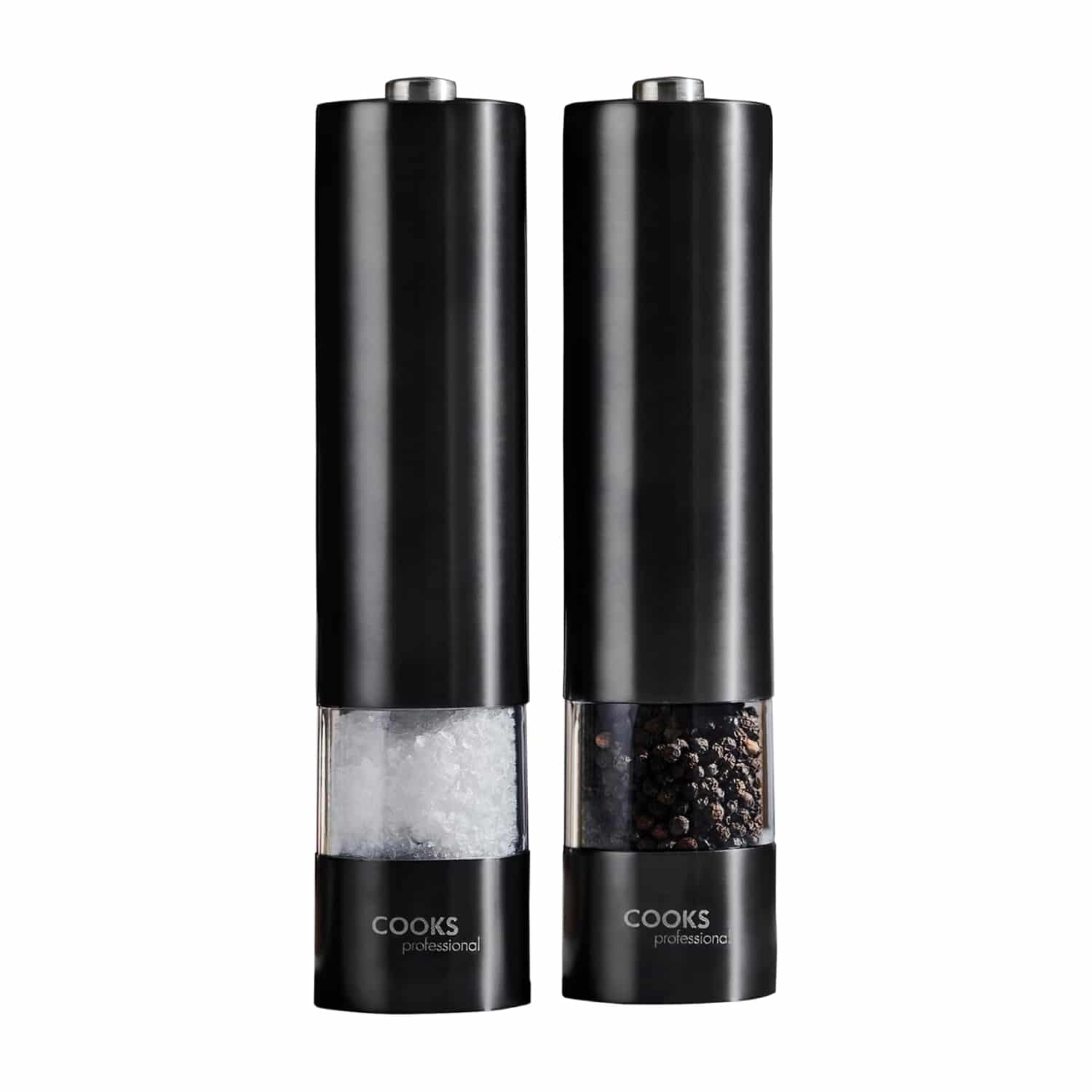 The Cooks Professional set delivers exceptional value with its dual-mill configuration and one-handed operation that simplifies seasoning during active cooking. The stainless steel construction offers durability while maintaining an attractive kitchen presence. At 22.3cm tall, these mills fit comfortably in most kitchen setups.