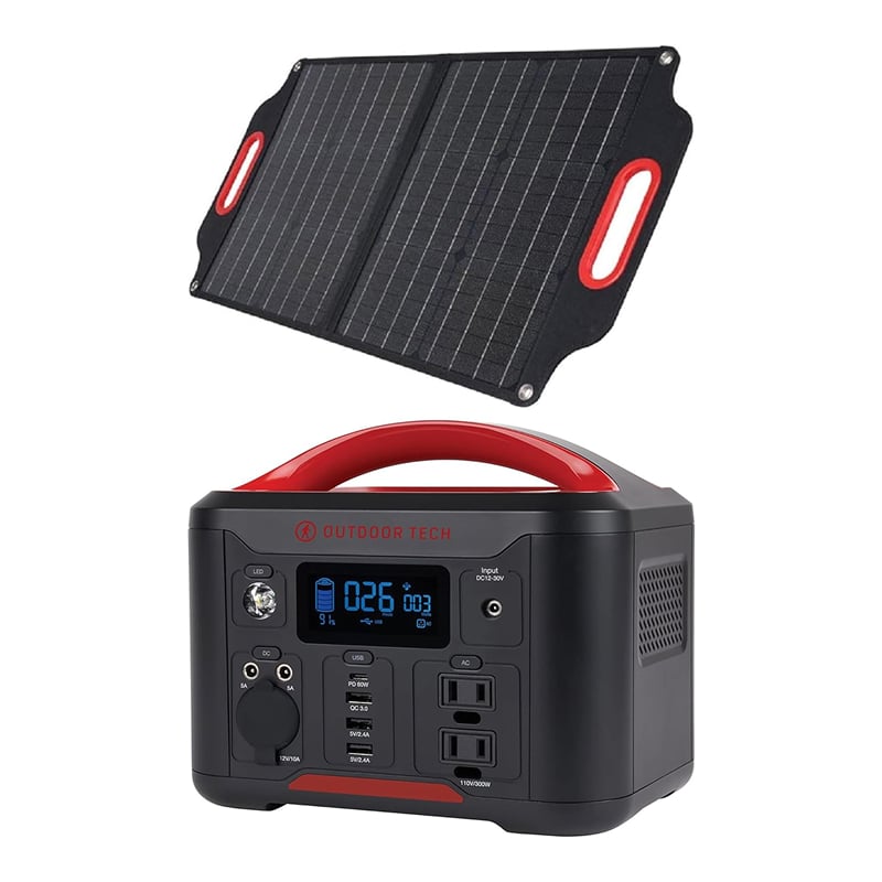 The Outdoor Tech Dawn+Grizzly bundle combines portable solar with substantial battery storage. The 40W Dawn panel features smart design elements like magnetic closure and LCD output display, while the Grizzly station offers 296Wh capacity. Together they provide balanced off-grid power for moderate needs.